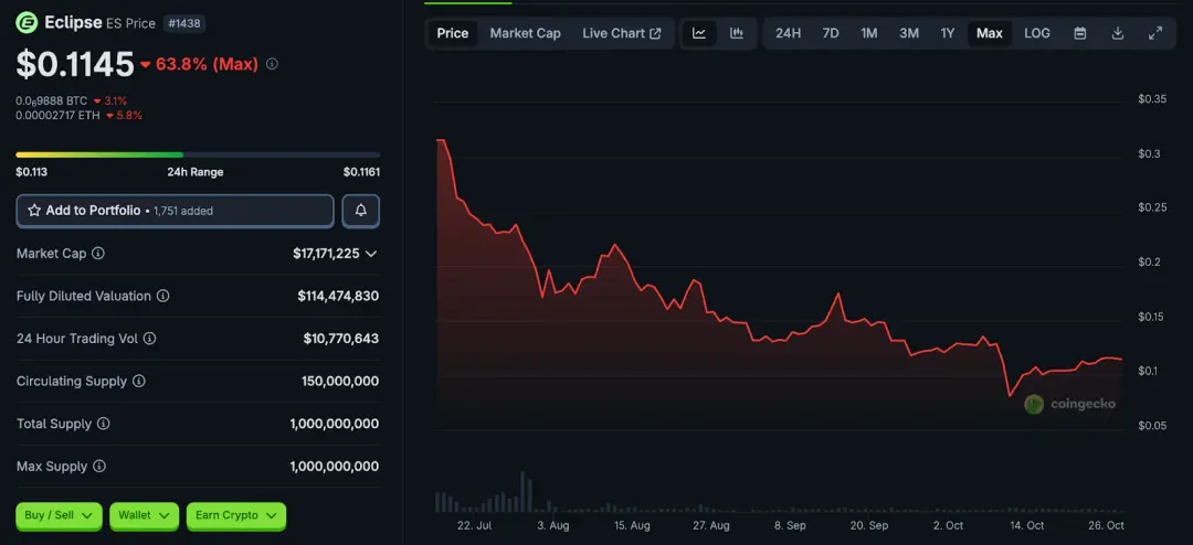 然而,从市场表现来看,ES 代币估值已经发生明显回撤。根据 CoinGecko 数据显示,ES 虽然还在交易,但较高点已大幅下跌约 64%。Eclipse 生态尚处于早期阶段,Roll‑up 或模组化链方案竞争激烈,多项目争夺 L2 赛道,项目市场落地的路径尚未完全显现。