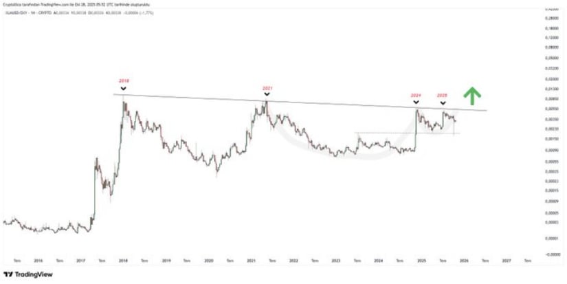 分析图表标注了象征突破潜力的绿色上升箭头,提示若价格强势收于阻力位上方将触发变盘。Cryptollica「买入$这些代币」的表述,反映出技术派交易者对多年压抑动能后迎来转折点的乐观预期。若突破成功,代币或将进入全新扩张阶段,剑指2017与2021年峰值水平;反之可能重回横盘整理,未来数周将成为确认方向的关键窗口。