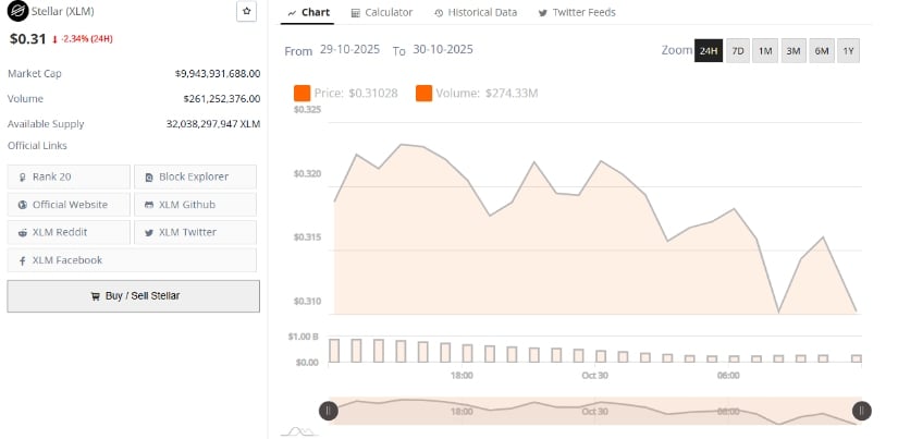 BraveNewCoin数据显示,恒星币现报0.31美元,24小时涨幅3.09%。网络市值约99.4亿美元,日交易量超2.61亿美元。该代币稳居加密货币前20名,维持着稳定流动性与网络活跃度。