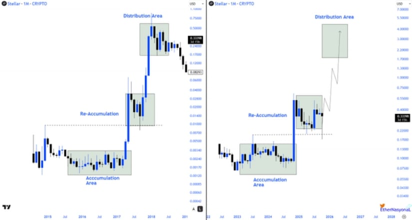 Crypto GEMs发布的独立分析将恒星币2015-2018与2023-2026年市场周期进行比对。图表左侧详述该代币此前遵循威科夫理论的「吸筹-再吸筹-派发」阶段,最终推动价格在2018年抛物线冲顶;右侧当前价格结构呈现高度镜像特征,分析师将其标注为「历史重演」。