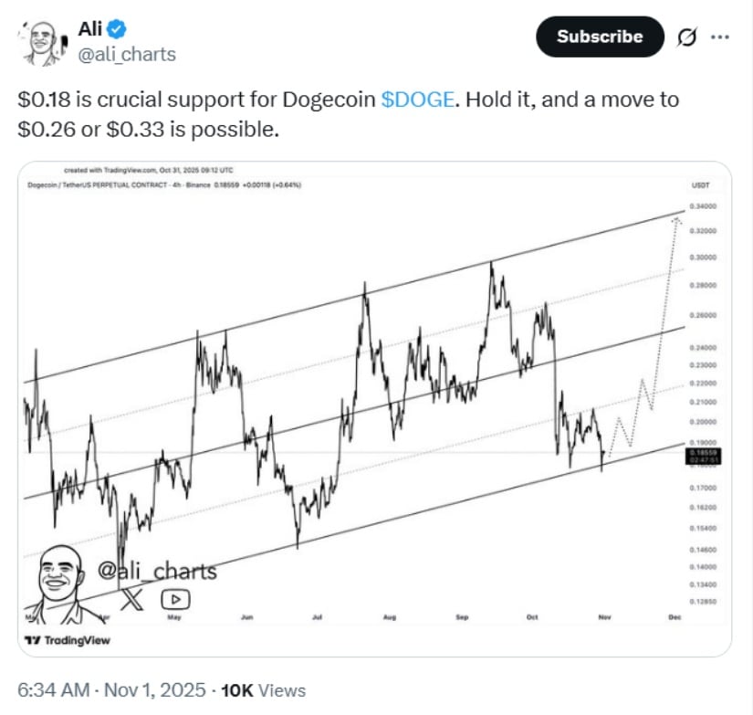 0.18美元仍是狗狗币(DOGE)的关键支撑位,若能守住则可能反弹至0.26或0.33美元。来源:Ali Martinez via X