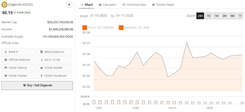 截至发稿,狗狗币报0.183美元,虽在支撑区上方展现韧性,但2025年11月1日的市场情绪仍显谨慎。