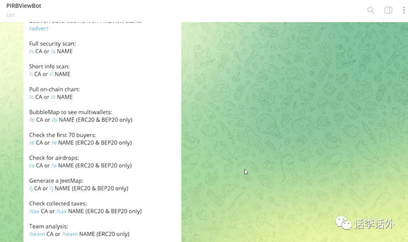 Pirb 也是一款免费的 TG 工具,可让你扫描任何合约地址进行检查、以进行狙击分析。该工具还提供了顶级持有者、代币分布、图表分析等功能。而且所有这些功能也都是可以免费使用的。
