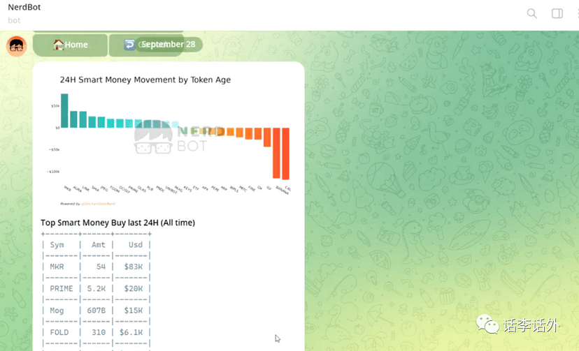 与上面提到的 TG 工具类似,你可以通过 Nerdbot 来查看指定钱包的交易行为。同时,你还可以向该机器人询问项目的资金流入情况,检查特定的智能合同等。