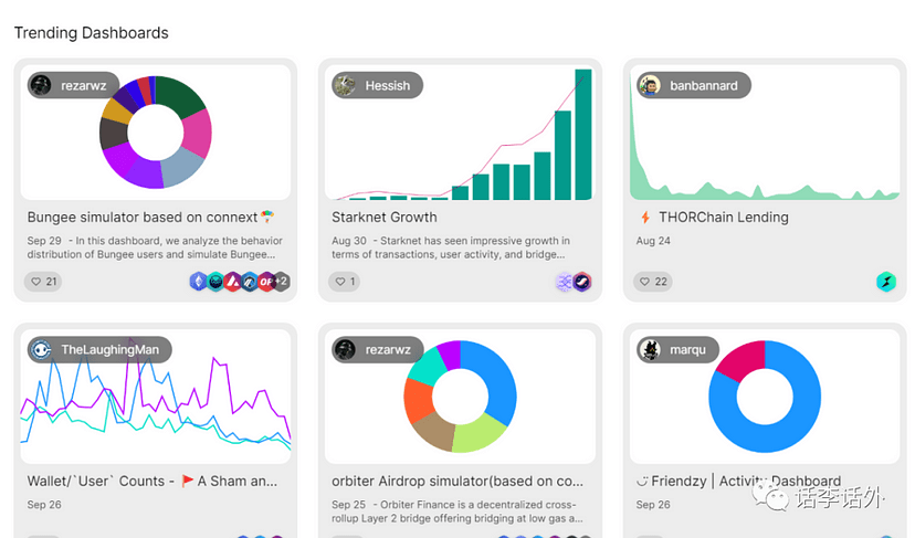 Dune 应该是目前这个领域里面最好用的数据仪表板工具了,你不仅可以通过它查看别人创建的各种可视化仪表板,而且也可以自己创建仪表板。比如,话李话外之前文章中的很多数据截图都是取材于这个平台里面。