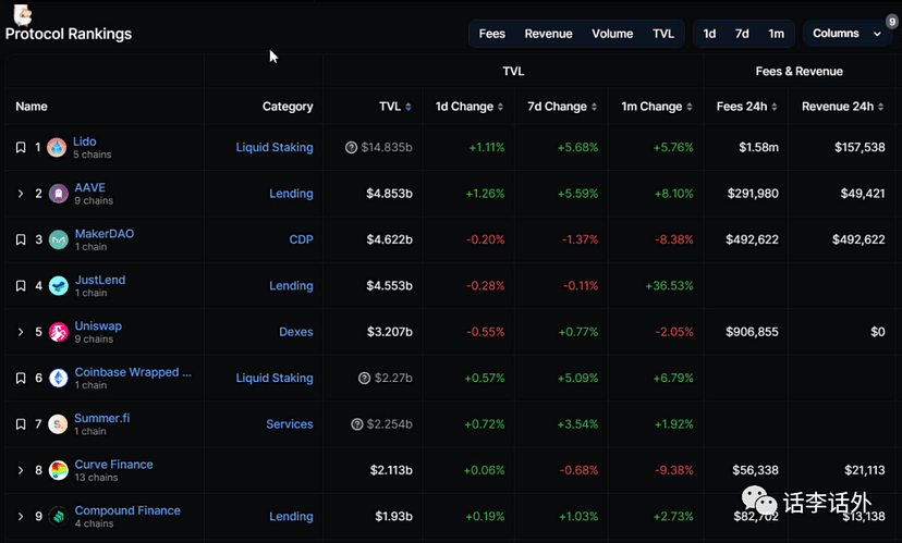 DefiLlama 也是我日常分析项目使用频率最高的工具之一,我认为它应该也是目前市场上最好用的项目分析免费工具。DeFillama 可以为你提供在某些项目和链上寻找动力所需的一切数据,比如指定项目的 TVL、活跃用户数、收入情况等等。