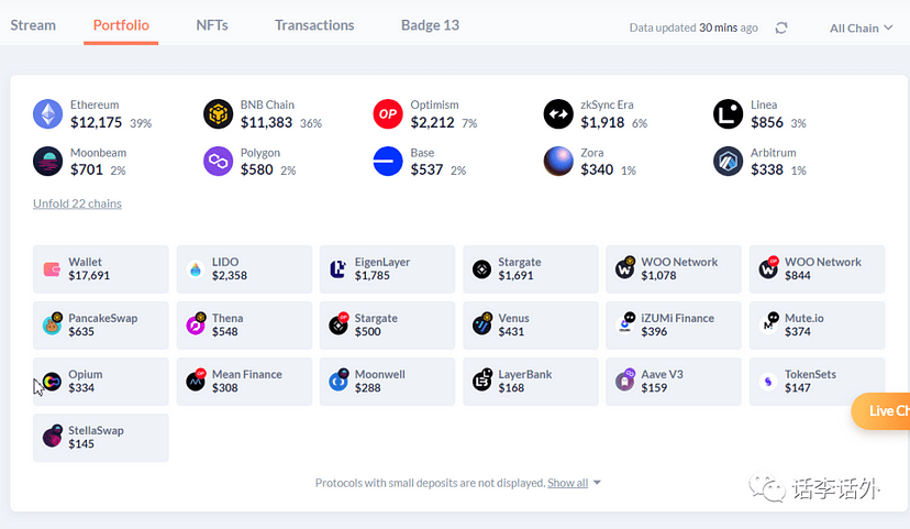 DeBank 也是我最常用的链上工具之一,一款非常好用的钱包管理和查询工具。虽然目前市场上出现了不少钱包管理工具的竞争者,但我认为,DeBank仍然是市场上最好的投资组合跟踪器之一。它可以跟踪你在所有不同链上的钱包余额,以及流动性池、质押代币、交易历史记录等。
