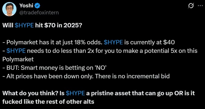 Yoshi的市场洞察显示,Polymarket参与者已开始对2025年HYPE价格押注70美元,反映出尽管该资产当前在40美元附近盘整,投机兴趣仍在增长。虽然当前概率仅为18%,但这一看涨预期的隐含概率表明市场对Hyperliquid长期潜力的信心。