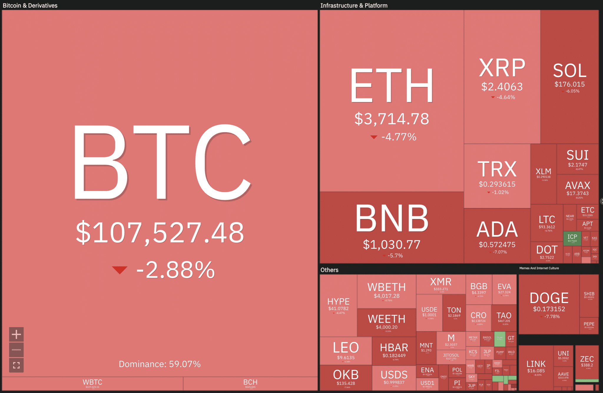 CoinMarketCap数据显示,比特币最新交易价报107,482美元附近,24小时跌幅达2.85%。Coinglass数据显示,这轮行情导致全网杠杆仓位爆仓超4.63亿美元。