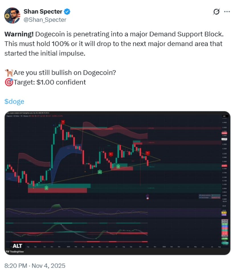 狗狗币正在测试关键需求支撑区,若守住该位置,则可能延续看涨动能冲击1美元目标。来源:@Shan_Specter via X