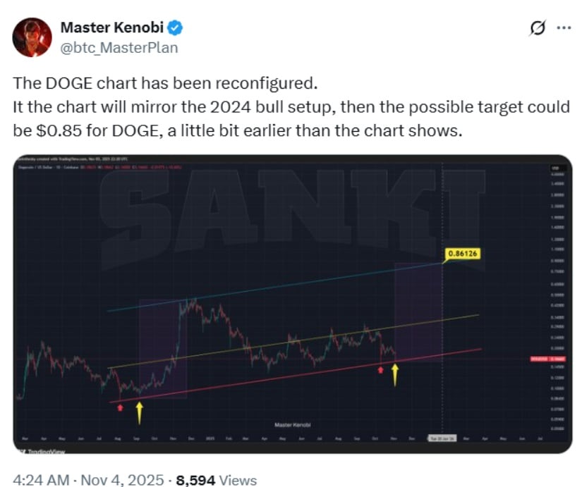 若狗狗币走势复制2024年牛市形态,或能提前触及0.85美元目标位。来源:@btc_MasterPlan via X
