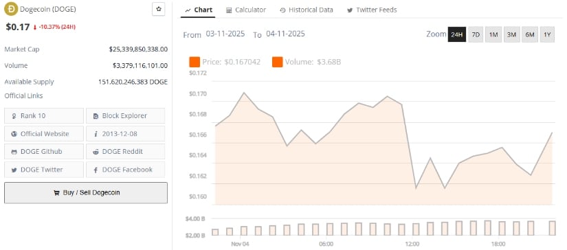 狗狗币现报0.17美元,24小时下跌10.37%。来源:Brave New Coin