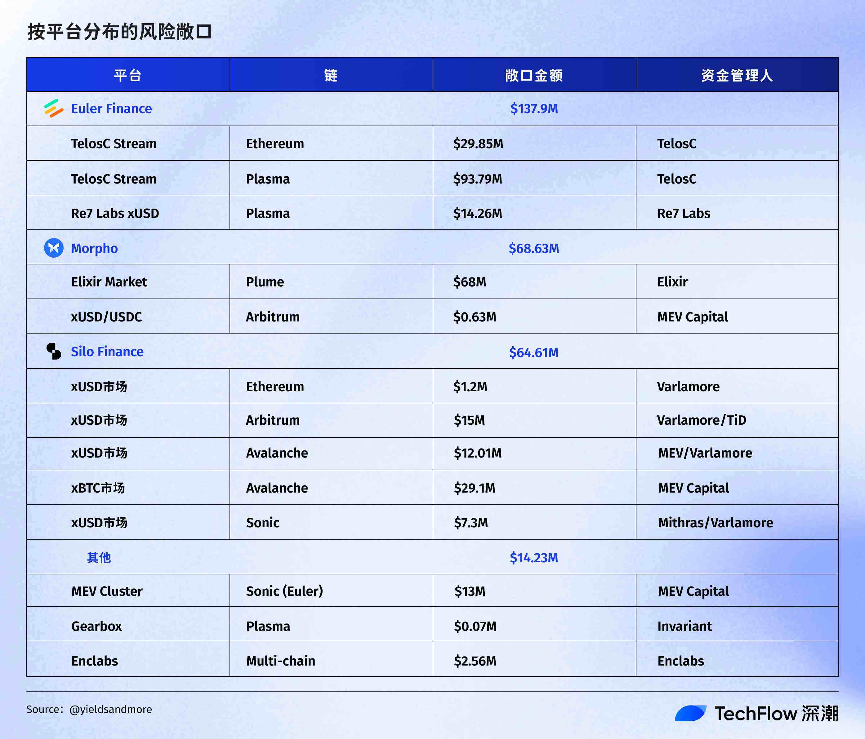 根据YAM的分析,2.85亿美元的债务分布在多个平台,由不同的"Curator"(资金管理人)负责。让我们看看具体哪些平台正坐在这个火药桶上:
