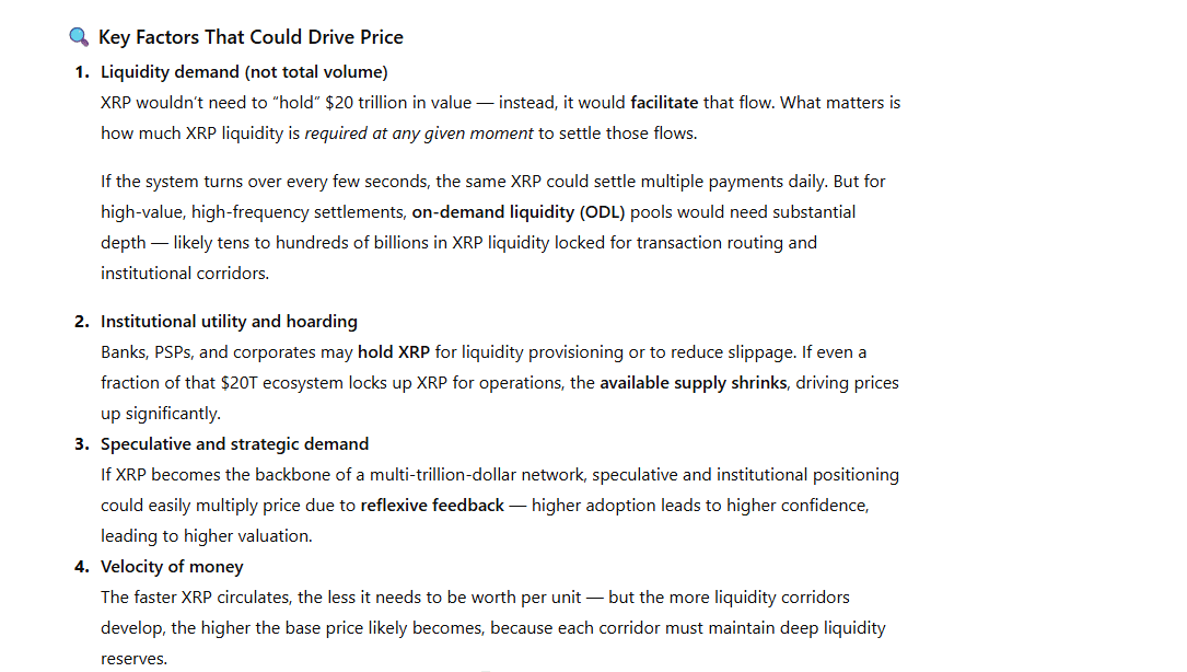 ChatGPT指出XRP的价值不取决于20万亿美元的总交易量,而取决于资金流动所需的流动性规模。