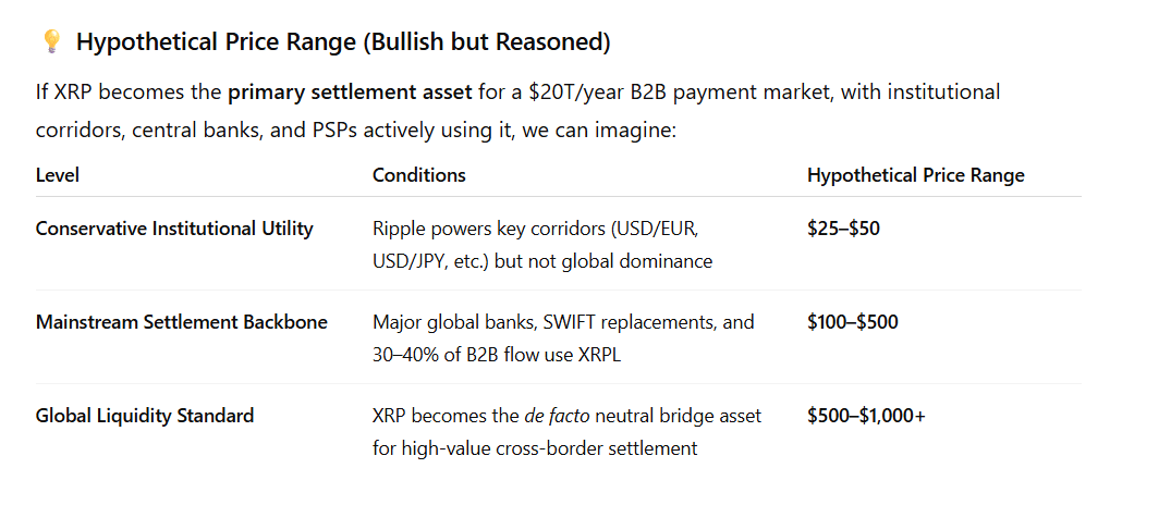 若Ripple成为全球30%-40%B2B支付的主流结算网络,代币价格或攀升至100-500美元。在更乐观情况下,当XRP成为跨境流动性的全球标准时,其价格可能突破1000美元。