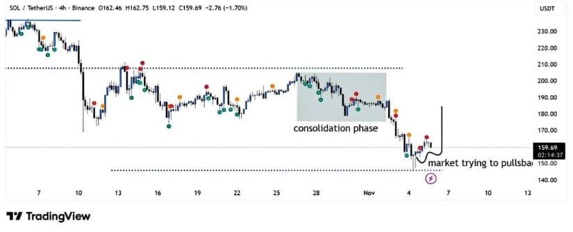 Solana价格测试150-160美元关键需求区,早期反转信号暗示买方力量复苏。来源:BitGuru via X