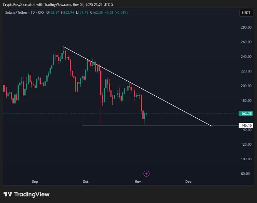 Solana在146-150美元附近形成潜在双底形态,预示趋势可能反转。来源:CryptoBusy via X