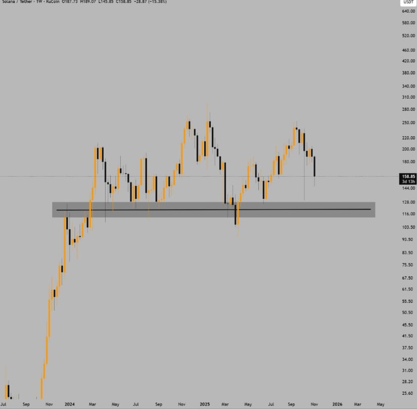 Solana测试120-130美元周线需求区块,买方力图防守该区域以促成反弹。来源:ShangoTrades via X