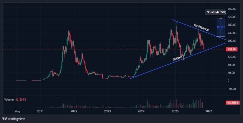 Robo对Solana周线图的分析揭示:自2023年初以来,一个大型上升三角形持续构筑。支撑趋势线历经多次考验保持稳固,而280-300美元附近的阻力正将价格压缩至逐渐收窄的顶点。