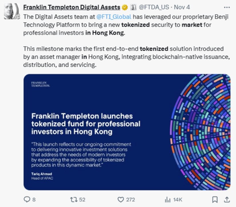 基金采用富兰克林邓普顿自主研发的Benji技术平台,实现从发行到分销的全链上操作,成为香港首支由资产管理公司推出的端到端代币化解决方案。