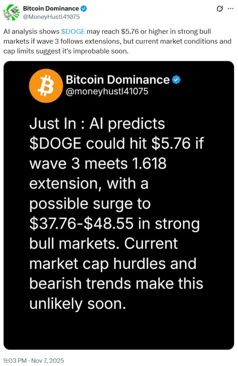 AI分析显示狗狗币($DOGE)在强势牛市中可能达到5.76美元,但当前市场条件与市值限制使短期暴涨可能性偏低。来源:@MoneyHustl41075 via X