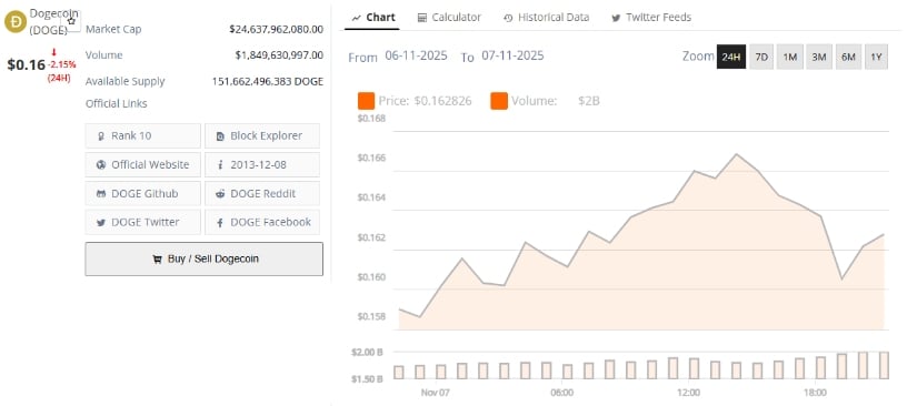 狗狗币现报约0.16美元,24小时跌幅2.15%。来源:Brave New Coin