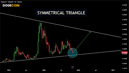 周线图显示价格正在接近该结构的下边界,此处出现反转的概率极高。三角形内的价格走势显示十月份已形成更高的高点,狗狗币可能即将迎来双向突破。鉴于当前结构始终捍卫0.15美元支撑位,该形态正倾向于看涨突破情景。