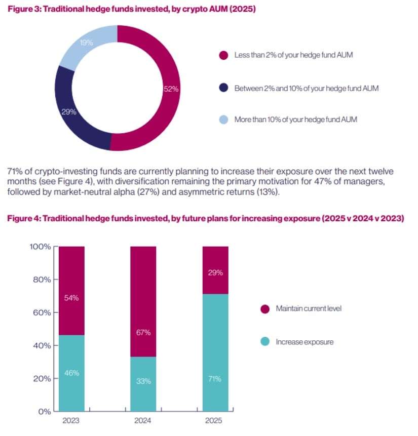 但未来图景截然不同:71%已涉足加密领域的对冲基金计划在未来12个月内追加投资,表明尽管当前持仓保守,机构对数字资产的信心正在增强。