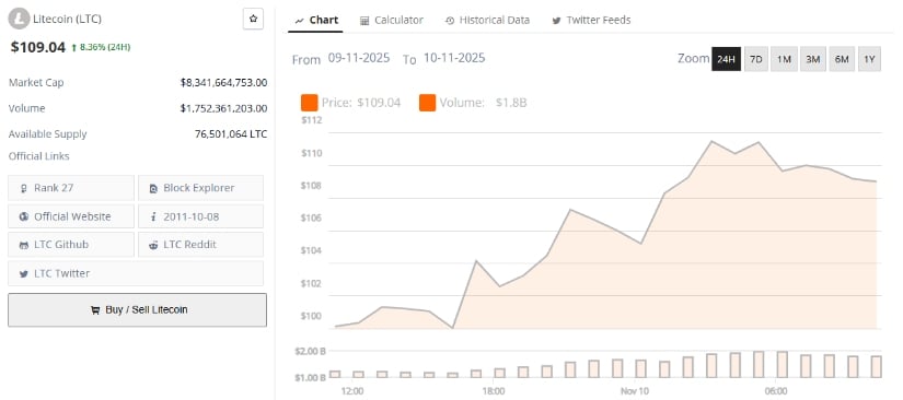 莱特币现报109.04美元,24小时涨幅8.36%。数据来源:Brave New Coin