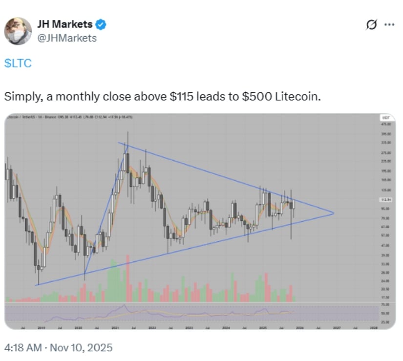 月线收盘突破115美元或为莱特币冲击500美元铺路。来源:@JHMarkets via X
