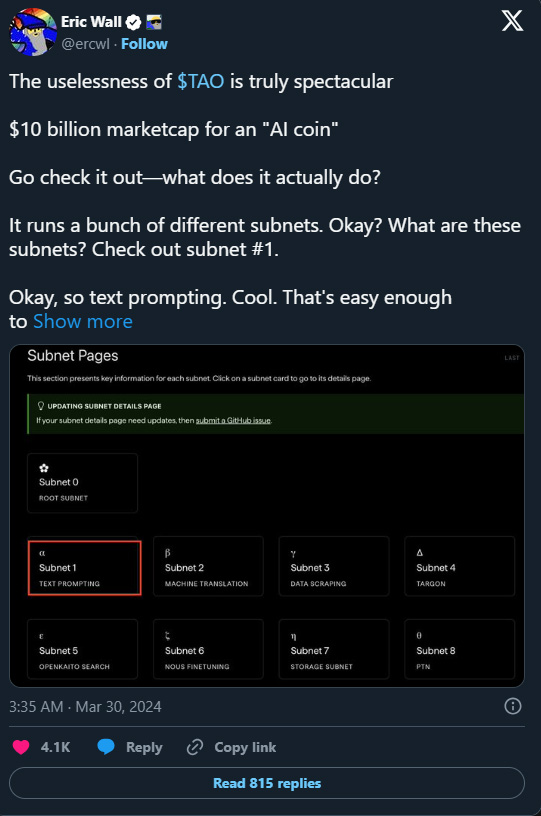 Bittensor 要解决的内核问题相当直接。当前的 AI 开发大多在孤岛中进行,大型公司为特定任务训练庞大模型,形成「赢者全拿」的环境。独立研究人员难以将成果变现,有价值的利基模型经常被遗弃。Bittensor 颠覆了这种模式,让 AI 系统自己判断什么是有价值的,并根据模型为网络提供的「信息理论价值」以 TAO 代币支付给贡献者。