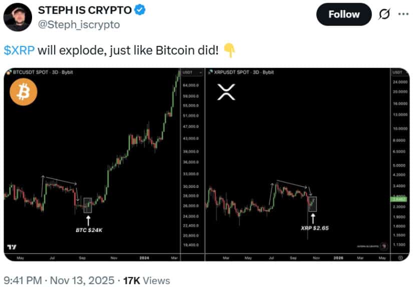 最新市场对比指出,比特币2024年初突破24,000美元盘整区的结构与XRP当前2.65美元附近形成的三角形态存在相似性。市场观察员Steph_iscrypto分享的图表显示,两者近乎完全对称的三角形此前曾预示比特币强势上涨。
