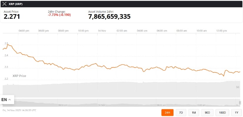 截至发稿,XRP报2.27美元,24小时下跌7.73%。来源:Brave New Coin XRP价格