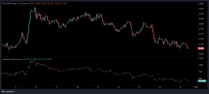 总未平仓合约(OI)指标传递相似信号:价格下跌时OI同步缩减,表明交易者正在平仓而非建新仓,反映杠杆参与者普遍缺乏信心。当前OI稳定在7650万左右,或预示潜在波动事件前的仓位布局。若WLD跌破0.70,下行趋势可能延续;反之若收复0.74-0.75区域,则可能是反转早期信号。
