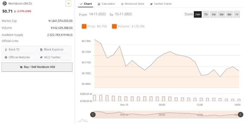 截至2025年11月15日,BraveNewCoin数据显示Worldcoin报价0.79美元,日内微涨0.50%。其市值达16.4亿美元,24小时交易量1.4242亿美元,流通供应量23.2亿枚,全球市值排名第72位。
