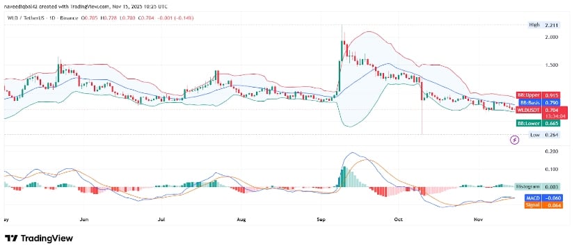 截至发稿,WLD/USDT交易于0.704美元附近,日线级别持续疲软。价格沿布林带下轨运行,表明处于低波动率的超卖区域。
