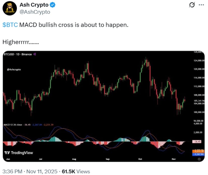 比特币在10.4万美元支撑区附近形成潜在MACD金叉,反弹行情可期。来源:@AshCrypto via X