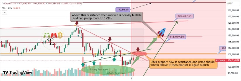 比特币在10.7-10.8万美元阻力区盘整,突破10.8万美元或打开至14万美元的上行空间。来源:TradingView上的MMBTtrader