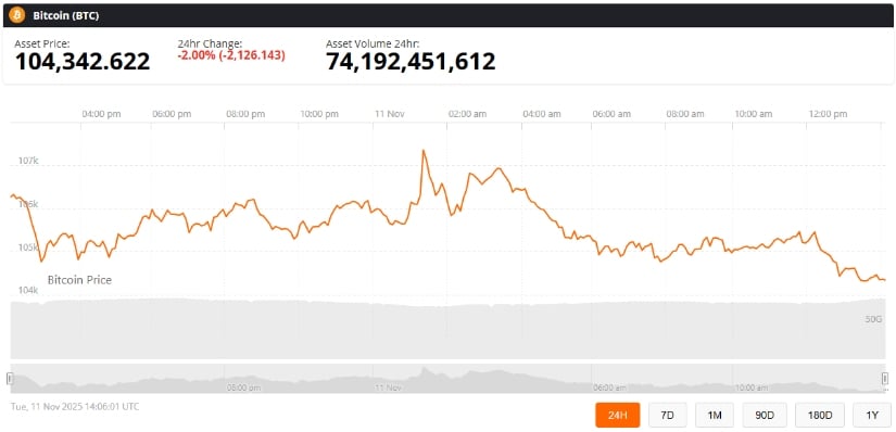 根据Brave New Coin比特币价格指数,截至2025年11月11日,比特币现报104,342美元,24小时跌幅约2%,交易量超740亿美元。