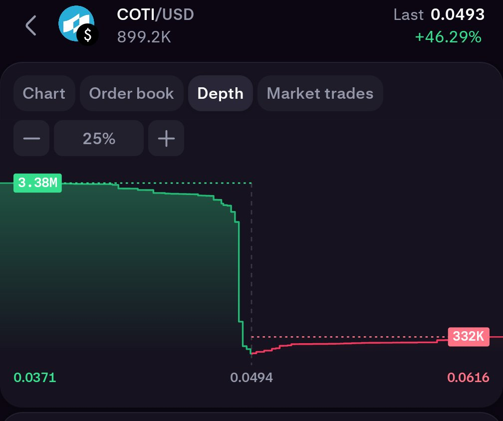 COTI/USDT深度图表显示买卖订单显著失衡。当前买单总量约338万单位,而卖单仅33.2万单位。
