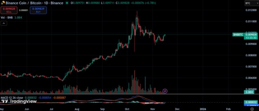 自11月回撤以来,该交易对持续形成更高的低点,表明市场存在积累兴趣而非抛售驱动的派发。价格当前正逼近0.0098-0.0100 BTC阻力集群,该区域历来会引发获利了结。