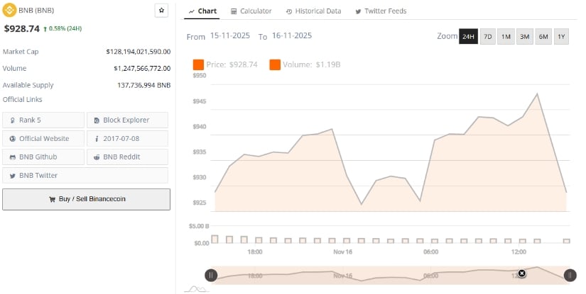 公开市场数据显示BNB当前报价约928.74美元,过去24小时上涨0.58%。