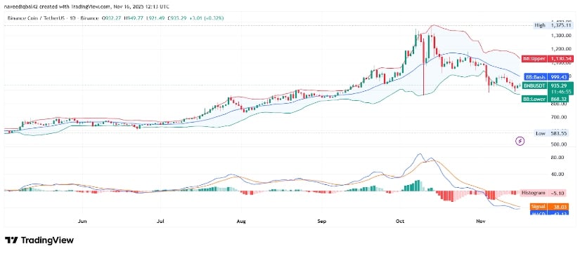 技术读数显示BNB在935美元附近交投,从1,375美元峰值回撤后于布林带下半区间盘整。此前在868美元附近的触碰引发了温和反弹,表明超卖阈值附近卖方动能减弱。
