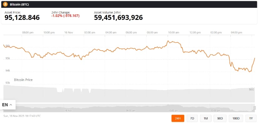 截至发稿,比特币报95,128美元,24小时下跌1.02%。来源:Brave New Coin比特币价格