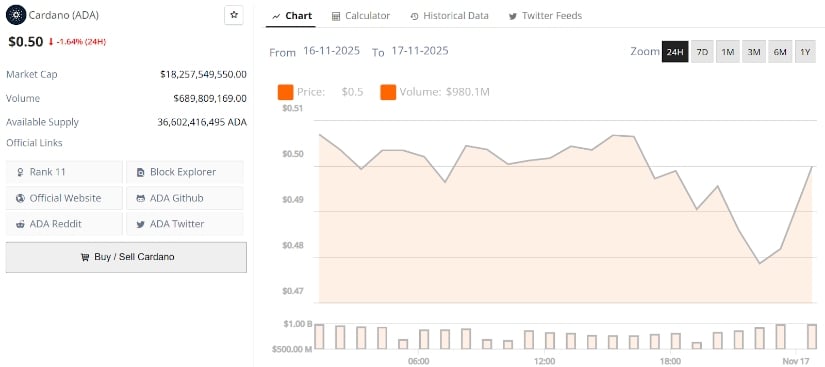 卡尔达诺现报0.50美元附近,24小时跌幅-1.64%。数据来源:Brave New Coin