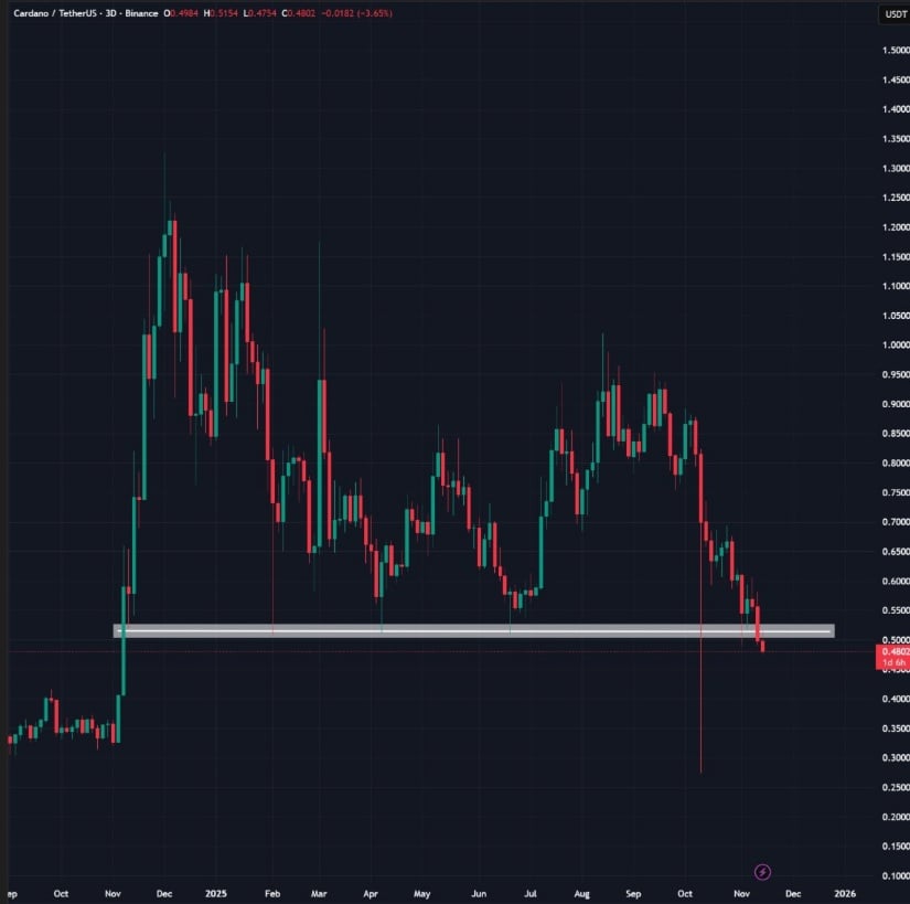 Crypto Chiefs图表显示价格明确跌破中期关键区间。ADA已决定性跌破0.50美元防线,下方形成巨大低效缺口。纯技术面而言,下一强劲支撑位于0.25美元——该高位时间框架支撑曾作为长达数月的筑底区域。