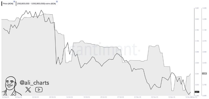 鲸鱼一月内抛售超4.4亿ADA,为本就疲软的图表增添额外卖压。数据来源:Ali Martinez via X