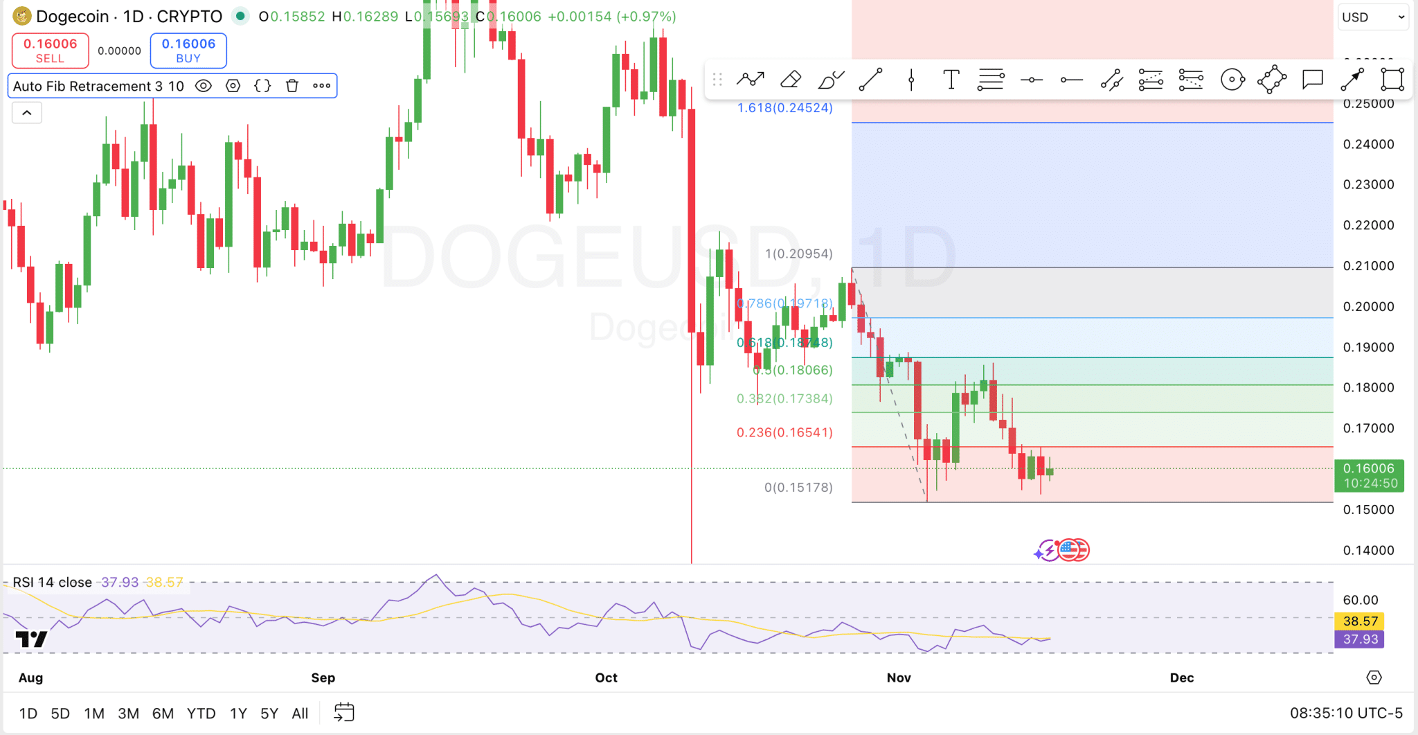 从技术层面观察,狗狗币日线图显示其在关键支撑区域上方进入盘整阶段。分析时报价0.161美元附近,低于0.236斐波那契阻力位0.16541美元——该位置过去数日持续形成压制。