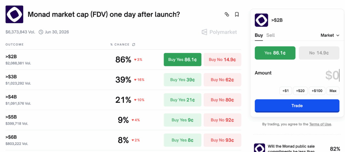 Polymarket数据显示,86%的交易者认为Monad市值将突破20亿美元,持此观点的合约成本为86美分;仅有21%的参与者押注其能达到40亿美元估值。市场情绪整体谨慎但偏乐观。
