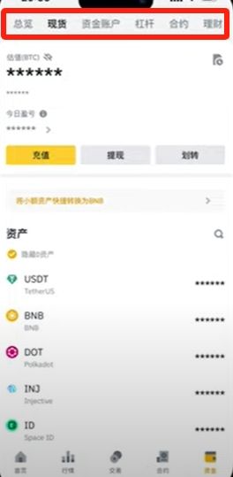 来到资金总览页面,顶部显示了5个账户。我们今天要关注的是现货账户和资金账户。如果你是法定货币购买USDT,币就在资金账户里。如果想用USDT购买其他币种,需要把USDT划转到现货账户里。我们今天充提币只会涉及到现货和资金这两个账户。